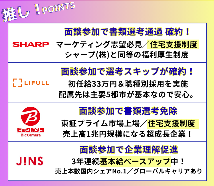 今回のイベントは、当日企業PR、座談会、面談に参加した全員に特別選考パスが付与される優遇イベントです。